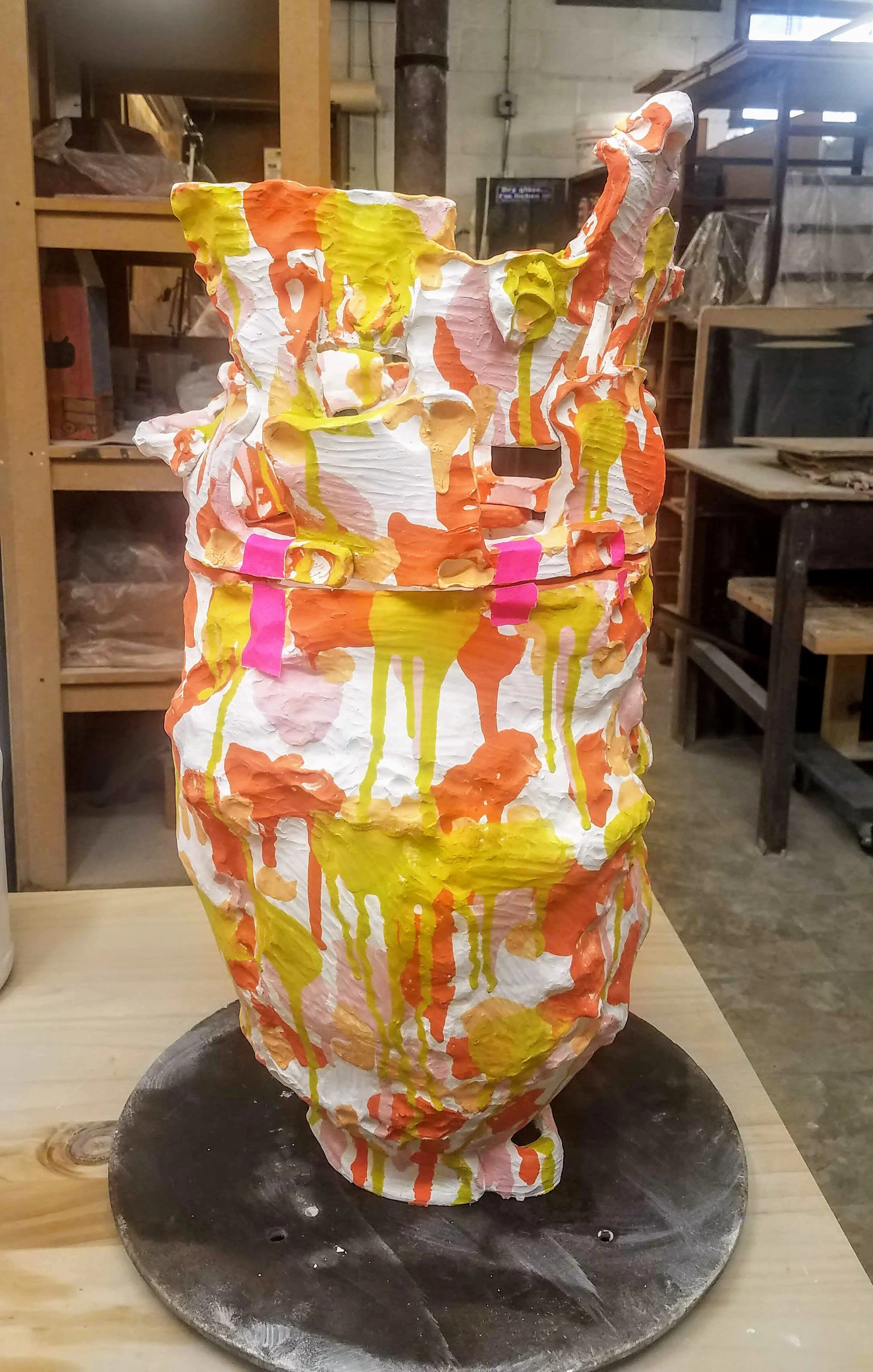Roughly constructed, the vessel allows me to play with the loose and layered application of glazes and underglazes related to my painting style. As a rule breaker I am committed to discovery that emerges from trial and error within loose parameters, rather than a plan for each piece.